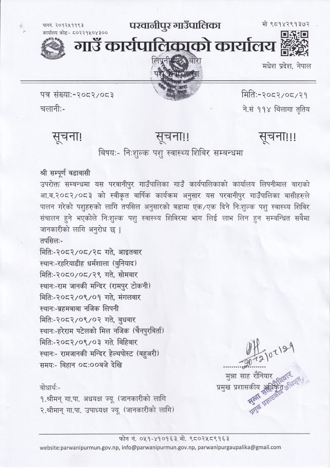 » निःशुल्क पशु स्वास्थ्य शिविर संचालन हुने सम्बन्धमा ।