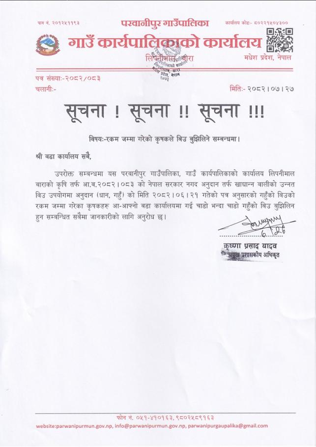 रकम जम्मा गरेको कृषकले बिउ बुझिलिने सम्बन्धमा ।