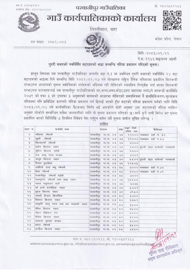गुदरी बजारको नवनिर्मित सटरहरुको भाडा सम्बन्धि नतिजा प्रकाशन गरिएको सूचना ।
