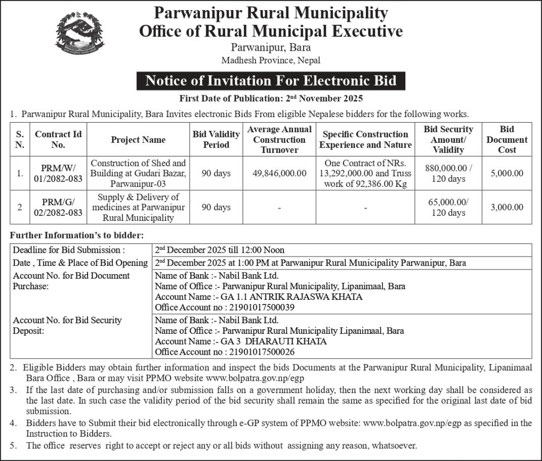 आ.व. २०८२/८३ को लागि जडीबुटी, कबाडी तथा जीवजन्तु कर संकलन ठेक्का बन्दोबस्त सम्बन्धी बोलपत्र आह्वानको सूचना